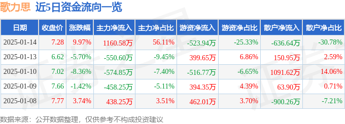 1月14日的资金流向数据方面,主力资金净流入1160.58万元,占总成交额56.11%,游资资金净流出523.94万元,占总成交额25.33%,散户资金净流出636.64万元,占总成交额30.78%。
