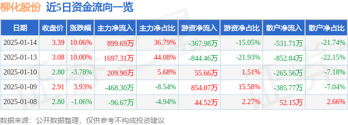 1月14日的资金流向数据方面,主力资金净流入899.69万元,占总成交额36.79%,游资资金净流出367.98万元,占总成交额15.05%,散户资金净流出531.71万元,占总成交额21.74%。