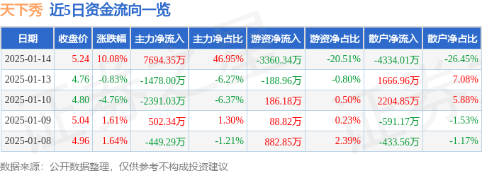 1月14日的资金流向数据方面,主力资金净流入7694.35万元,占总成交额46.95%,游资资金净流出3360.34万元,占总成交额20.51%,散户资金净流出4334.01万元,占总成交额26.45%。