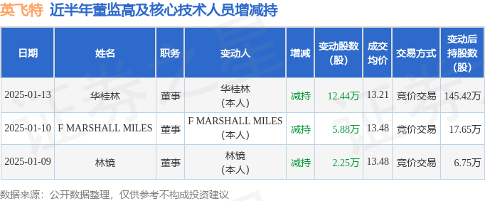 英飞特近半年内的董监高及核心技术人员增减持详情如下: