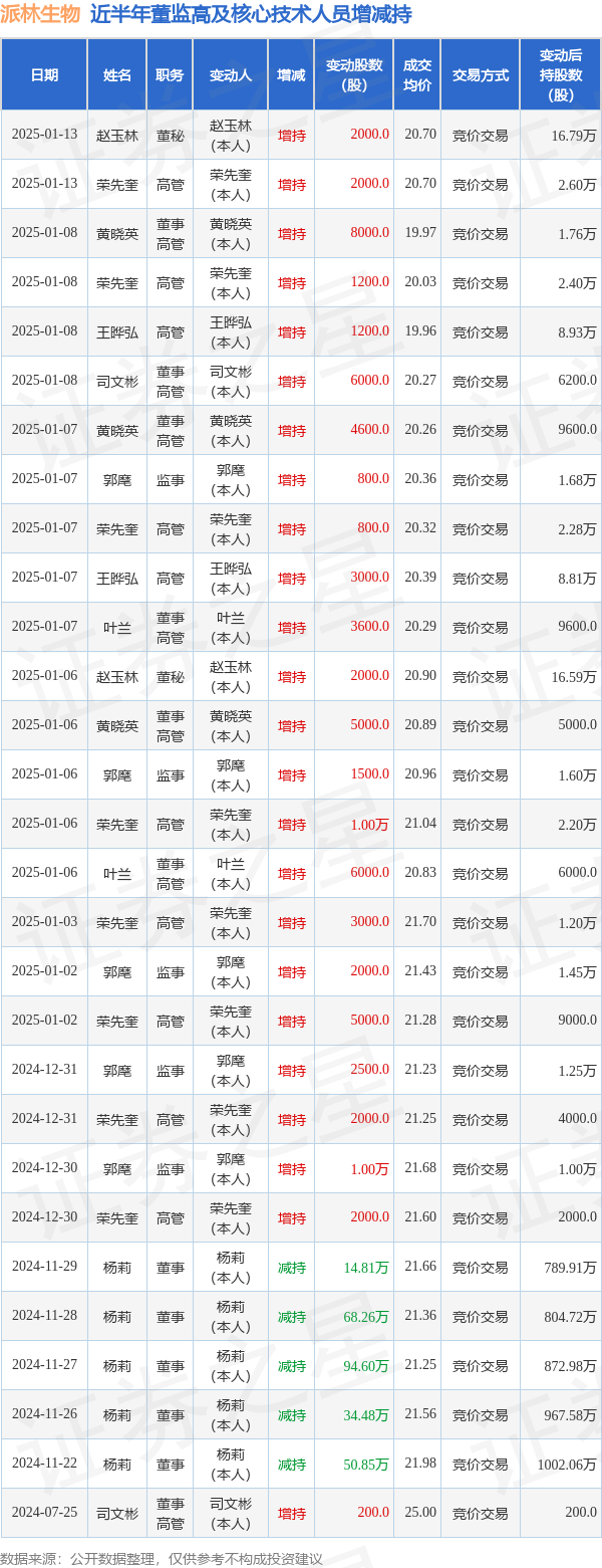 派林生物近半年内的董监高及核心技术人员增减持详情如下: