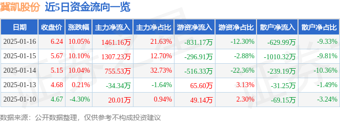 1月16日的资金流向数据方面,主力资金净流入1461.16万元,占总成交额21.63%,游资资金净流出831.17万元,占总成交额12.3%,散户资金净流出629.99万元,占总成交额9.33%。