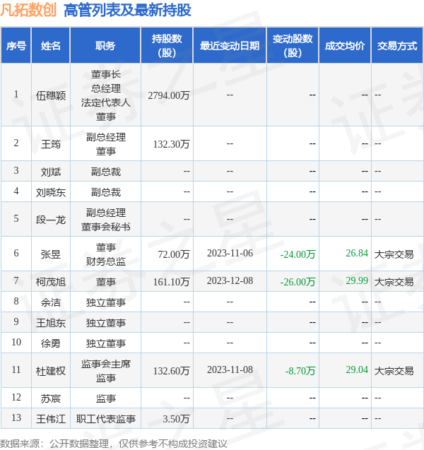 凡拓数创近半年内的董监高及核心技术人员增减持详情如下: