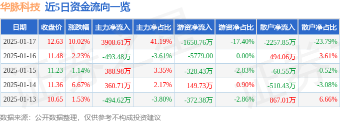 1月17日的资金流向数据方面,主力资金净流入3908.61万元,占总成交额41.19%,游资资金净流出1650.76万元,占总成交额17.4%,散户资金净流出2257.85万元,占总成交额23.79%。