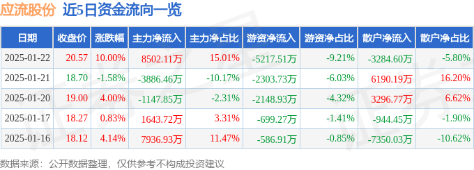 1月22日的资金流向数据方面,主力资金净流入8502.11万元,占总成交额15.01%,游资资金净流出5217.51万元,占总成交额9.21%,散户资金净流出3284.6万元,占总成交额5.8%。