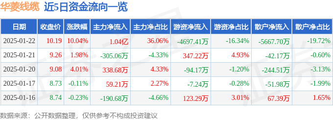 1月22日的资金流向数据方面,主力资金净流入1.04亿元,占总成交额36.06%,游资资金净流出4697.41万元,占总成交额16.34%,散户资金净流出5667.7万元,占总成交额19.72%。