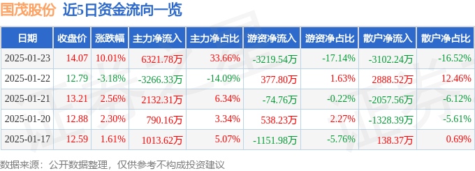 1月23日的资金流向数据方面,主力资金净流入6321.78万元,占总成交额33.66%,游资资金净流出3219.54万元,占总成交额17.14%,散户资金净流出3102.24万元,占总成交额16.52%。