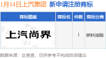 今年以来上海汽车集团股份有限公司新申请注册商标6件,截止目前公司共持有注册商标2814件,另有96件商标尚在注册申请中。