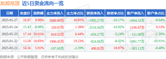 1月27日的资金流向数据方面,主力资金净流入3689.9万元,占总成交额18.81%,游资资金净流出1995.57万元,占总成交额10.17%,散户资金净流出1694.33万元,占总成交额8.64%。