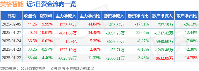 2月5日的资金流向数据方面,主力资金净流入1225.56万元,占总成交额44.04%,游资资金净流出498.37万元,占总成交额17.91%,散户资金净流出727.19万元,占总成交额26.13%。