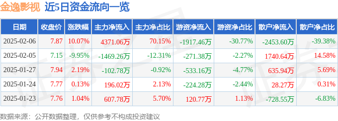 2月6日的资金流向数据方面,主力资金净流入4371.06万元,占总成交额70.15%,游资资金净流出1917.46万元,占总成交额30.77%,散户资金净流出2453.6万元,占总成交额39.38%。