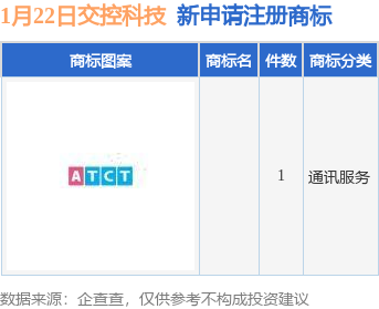 今年以来交控科技股份有限公司新申请注册商标1件,截止目前公司共持有注册商标64件,另有25件商标尚在注册申请中。