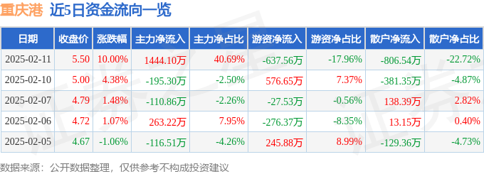 2月11日的资金流向数据方面,主力资金净流入1444.1万元,占总成交额40.69%,游资资金净流出637.56万元,占总成交额17.96%,散户资金净流出806.54万元,占总成交额22.72%。