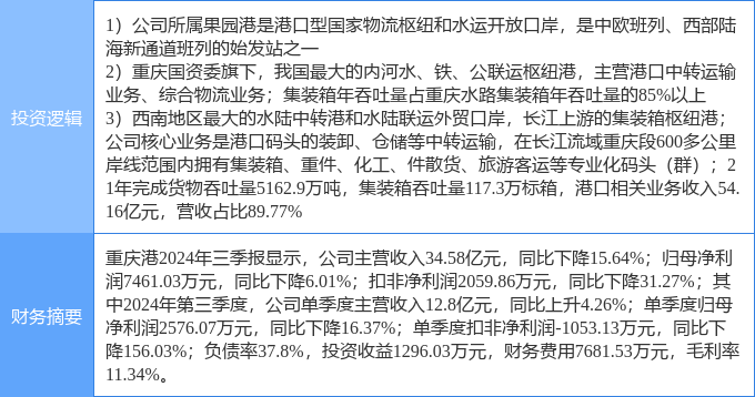 该股为港口,重庆国企改革,中欧班列概念热股,当日港口概念上涨0.91%,重庆国企改革概念上涨0.34%。