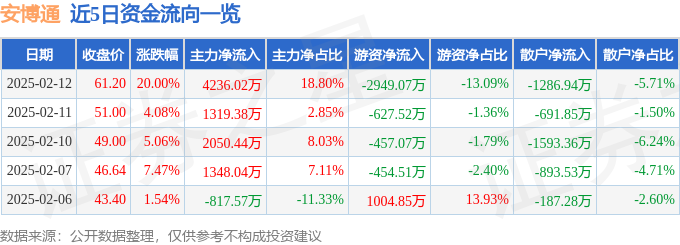 2月12日的资金流向数据方面,主力资金净流入4236.02万元,占总成交额18.8%,游资资金净流出2949.07万元,占总成交额13.09%,散户资金净流出1286.94万元,占总成交额5.71%。