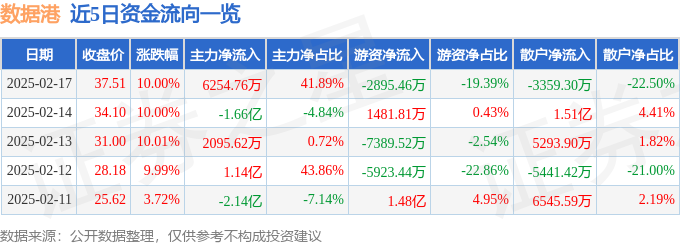2月17日的资金流向数据方面,主力资金净流入6254.76万元,占总成交额41.89%,游资资金净流出2895.46万元,占总成交额19.39%,散户资金净流出3359.3万元,占总成交额22.5%。