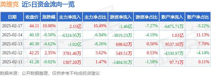 2月17日的资金流向数据方面,主力资金净流入2.11亿元,占总成交额10.49%,游资资金净流出1.46亿元,占总成交额7.27%,散户资金净流出6475.71万元,占总成交额3.22%。