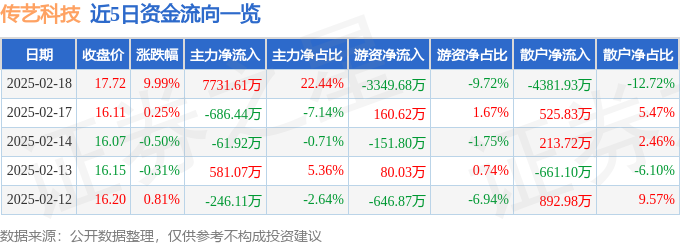 2月18日的资金流向数据方面,主力资金净流入7731.61万元,占总成交额22.44%,游资资金净流出3349.68万元,占总成交额9.72%,散户资金净流出4381.93万元,占总成交额12.72%。