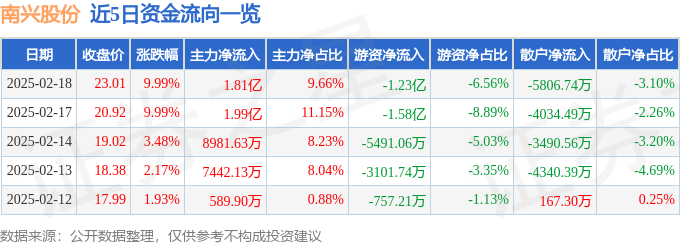 2月18日的资金流向数据方面,主力资金净流入1.81亿元,占总成交额9.66%,游资资金净流出1.23亿元,占总成交额6.56%,散户资金净流出5806.74万元,占总成交额3.1%。