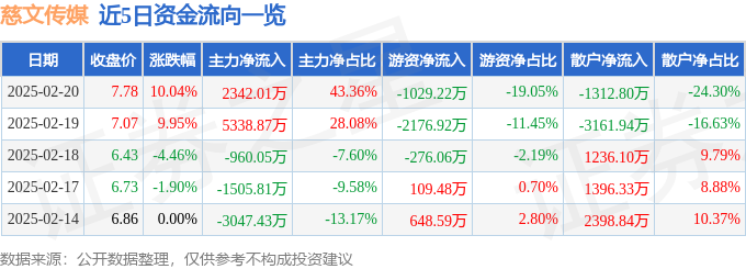 2月20日的资金流向数据方面,主力资金净流入2342.01万元,占总成交额43.36%,游资资金净流出1029.22万元,占总成交额19.05%,散户资金净流出1312.8万元,占总成交额24.3%。