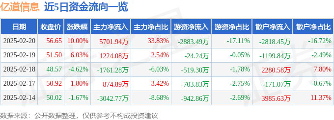 2月20日的资金流向数据方面,主力资金净流入5701.94万元,占总成交额33.83%,游资资金净流出2883.49万元,占总成交额17.11%,散户资金净流出2818.45万元,占总成交额16.72%。