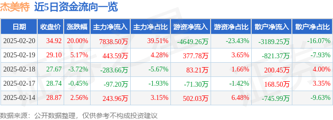 2月20日的资金流向数据方面,主力资金净流入7838.5万元,占总成交额39.51%,游资资金净流出4649.26万元,占总成交额23.43%,散户资金净流出3189.25万元,占总成交额16.07%。