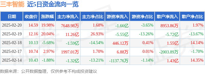 2月20日的资金流向数据方面,主力资金净流入7648.98万元,占总成交额1.68%,游资资金净流出1.66亿元,占总成交额3.65%,散户资金净流入8953.86万元,占总成交额1.97%。