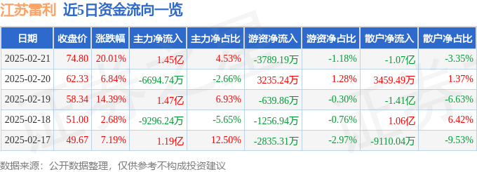 2月21日的资金流向数据方面,主力资金净流入1.45亿元,占总成交额4.53%,游资资金净流出3789.19万元,占总成交额1.18%,散户资金净流出1.07亿元,占总成交额3.35%。
