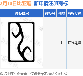 今年以来比亚迪股份有限公司新申请注册商标11件,截止目前公司共持有注册商标2854件,另有655件商标尚在注册申请中。