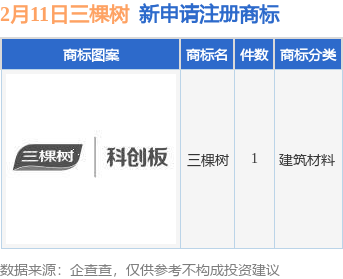 今年以来三棵树涂料股份有限公司新申请注册商标7件,截止目前公司共持有注册商标1980件,另有375件商标尚在注册申请中。