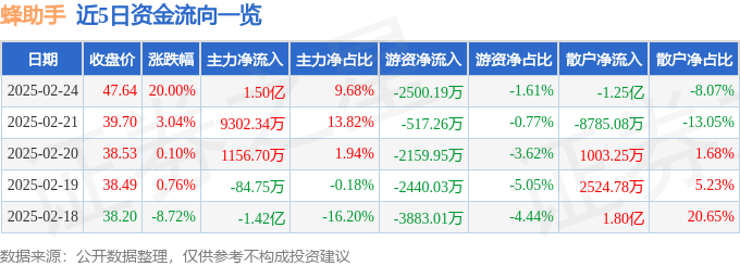 2月24日的资金流向数据方面,主力资金净流入1.5亿元,占总成交额9.68%,游资资金净流出2500.19万元,占总成交额1.61%,散户资金净流出1.25亿元,占总成交额8.07%。