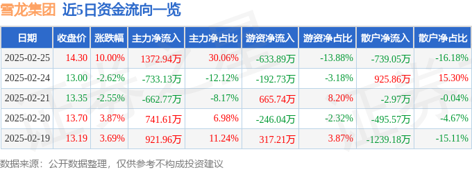 2月25日的资金流向数据方面,主力资金净流入1372.94万元,占总成交额30.06%,游资资金净流出633.89万元,占总成交额13.88%,散户资金净流出739.05万元,占总成交额16.18%。
