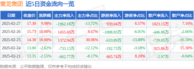 2月27日的资金流向数据方面,主力资金净流出1962.18万元,占总成交额13.72%,游资资金净流入939.04万元,占总成交额6.57%,散户资金净流入1023.15万元,占总成交额7.16%。