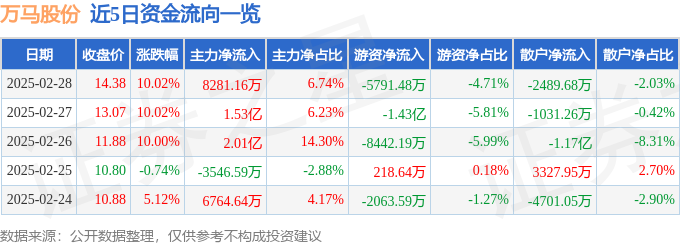 2月28日的资金流向数据方面,主力资金净流入8281.16万元,占总成交额6.74%,游资资金净流出5791.48万元,占总成交额4.71%,散户资金净流出2489.68万元,占总成交额2.03%。