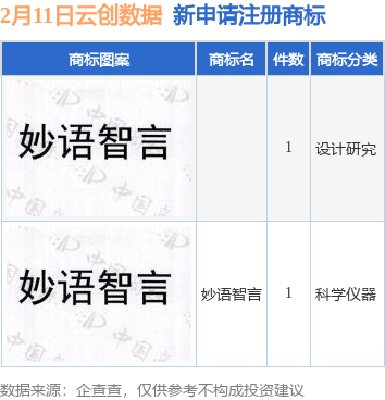 今年以来南京云创大数据科技股份有限公司新申请注册商标2件,截止目前公司共持有注册商标192件,另有13件商标尚在注册申请中。