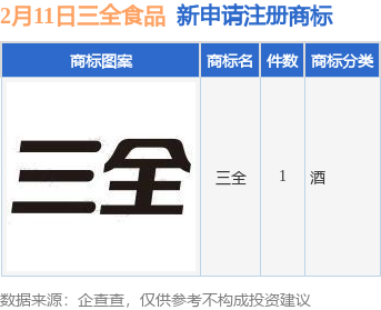 今年以来三全食品股份有限公司新申请注册商标1件,截止目前公司共持有注册商标2028件,另有111件商标尚在注册申请中。