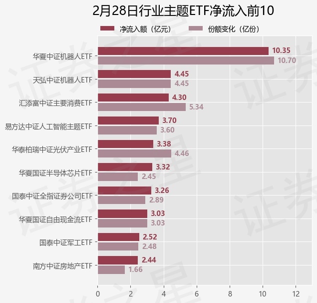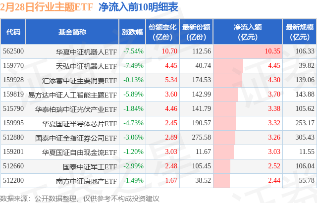 当日有178只行业主题ETF基金出现资金净流入,其中净流入排首位的是华夏中证机器人ETF(562500),份额增加了10.7亿份,净流入额为10.35亿元。