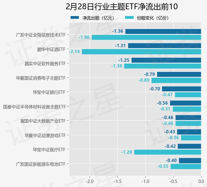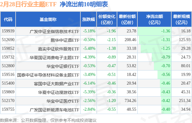 当日有109只行业主题ETF基金出现资金净流出,其中净流出排首位的是广发中证全指信息技术ETF(159939),份额减少了1.96亿份,净流出额为1.36亿元。