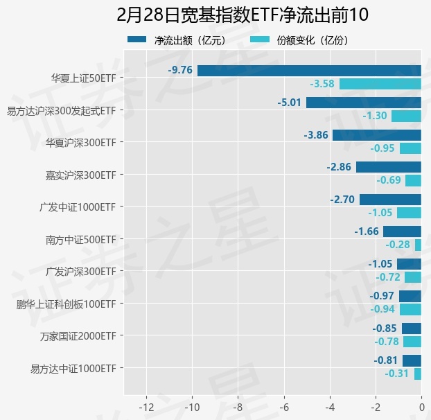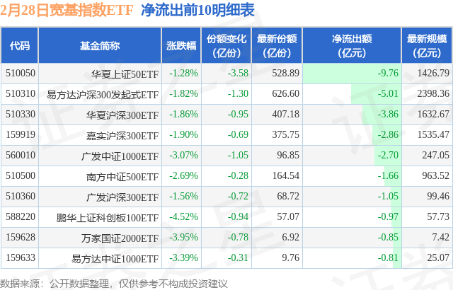 当日有88只宽基指数ETF基金出现资金净流出,其中净流出排首位的是华夏上证50ETF(510050),份额减少了3.58亿份,净流出额为9.76亿元。