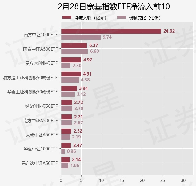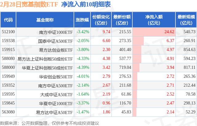 当日有77只宽基指数ETF基金出现资金净流入,其中净流入排首位的是南方中证1000ETF(512100),份额增加了9.74亿份,净流入额为24.62亿元。