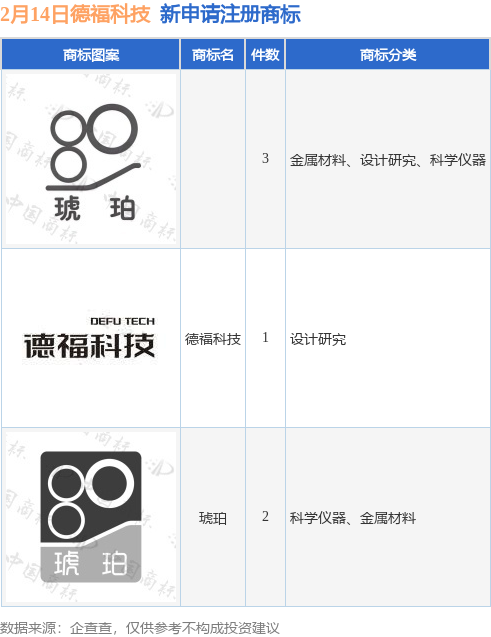 今年以来九江德福科技股份有限公司新申请注册商标6件,截止目前公司共持有注册商标4件,另有6件商标尚在注册申请中。