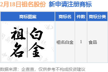 今年以来祖名豆制品股份有限公司新申请注册商标2件,截止目前公司共持有注册商标586件,另有22件商标尚在注册申请中。
