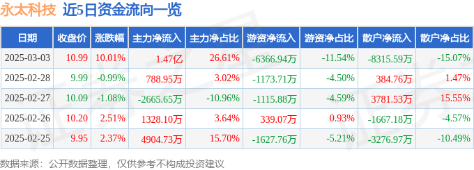 3月3日的资金流向数据方面,主力资金净流入1.47亿元,占总成交额26.61%,游资资金净流出6366.94万元,占总成交额11.54%,散户资金净流出8315.59万元,占总成交额15.07%。
