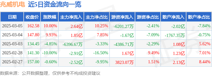 3月5日的资金流向数据方面,主力资金净流入2.64亿元,占总成交额10.25%,游资资金净流出6201.27万元,占总成交额2.41%,散户资金净流出2.02亿元,占总成交额7.84%。