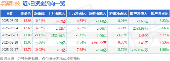 3月5日的资金流向数据方面,主力资金净流入5.82亿元,占总成交额14.83%,游资资金净流出3.14亿元,占总成交额8.01%,散户资金净流出2.68亿元,占总成交额6.83%。
