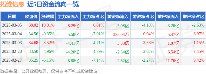 3月5日的资金流向数据方面,主力资金净流入8.29亿元,占总成交额6.81%,游资资金净流出5.08亿元,占总成交额4.18%,散户资金净流出3.2亿元,占总成交额2.63%。