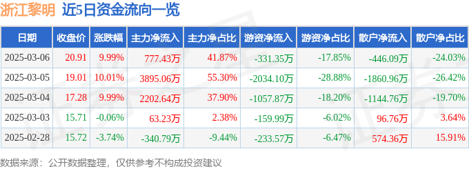 3月6日的资金流向数据方面,主力资金净流入777.43万元,占总成交额41.87%,游资资金净流出331.35万元,占总成交额17.85%,散户资金净流出446.09万元,占总成交额24.03%。