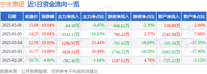 3月6日的资金流向数据方面,主力资金净流出84.18万元,占总成交额0.45%,游资资金净流出446.62万元,占总成交额2.39%,散户资金净流入530.8万元,占总成交额2.84%。