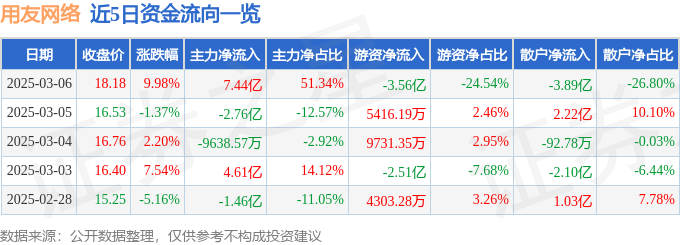 3月6日的资金流向数据方面,主力资金净流入7.44亿元,占总成交额51.34%,游资资金净流出3.56亿元,占总成交额24.54%,散户资金净流出3.89亿元,占总成交额26.8%。