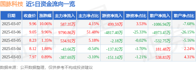 3月7日的资金流向数据方面,主力资金净流入587.35万元,占总成交额4.15%,游资资金净流入499.59万元,占总成交额3.53%,散户资金净流出1086.94万元,占总成交额7.68%。
